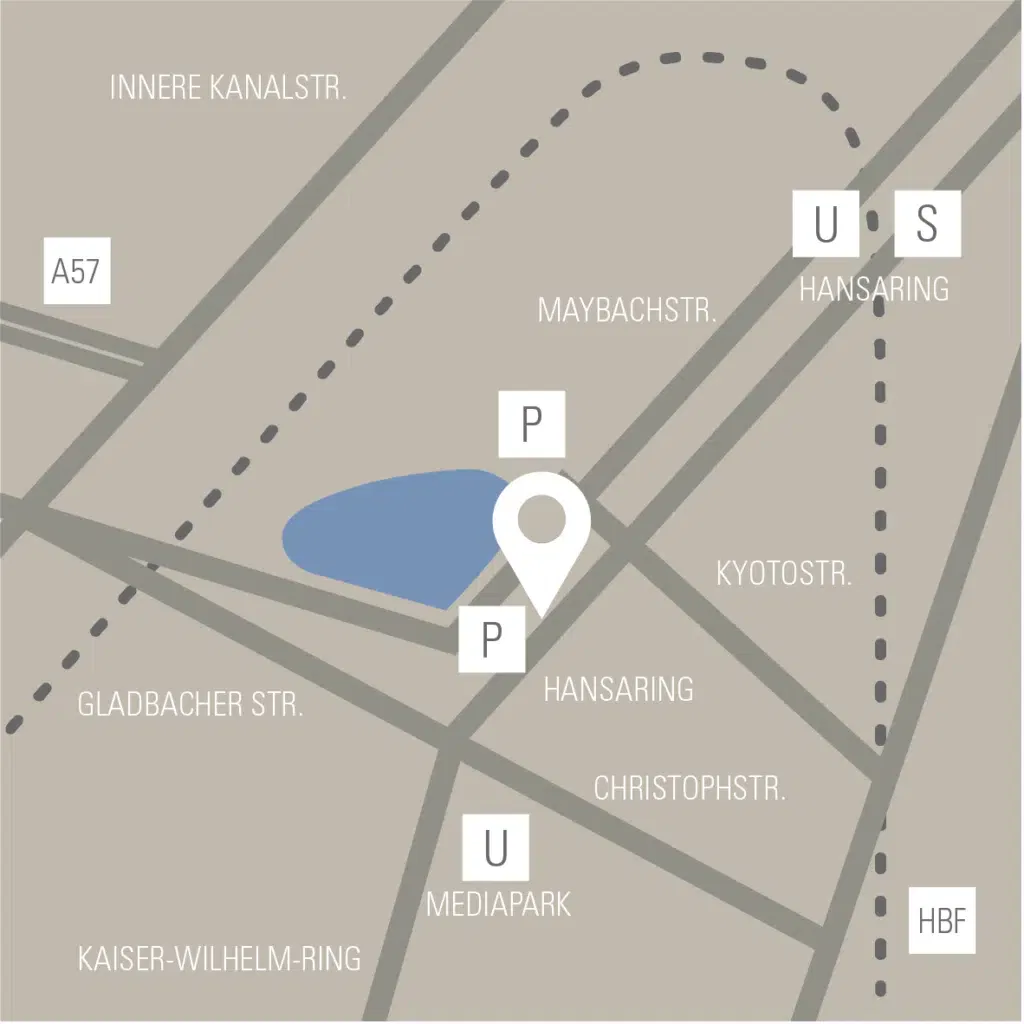 per ÖPNV Haltestelle Christophstr./Mediapark oder Hansaring