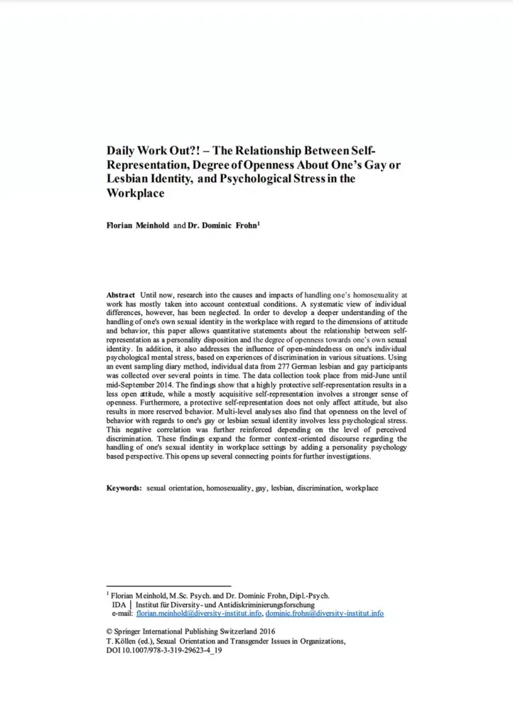 The purpose of this paper is to allow quantitative statements about the relationship between selfrepresentation as a personality disposition and the degree of openness towards one’s own sexual identity, to develop a deeper understanding of the handling of one’s own sexual identity in the workplace with regard to the dimensions of attitude and behavior. In addition, it also addresses the influence of open-mindedness on one’s individual psychological mental stress, based on experiences of discrimination in various situations.